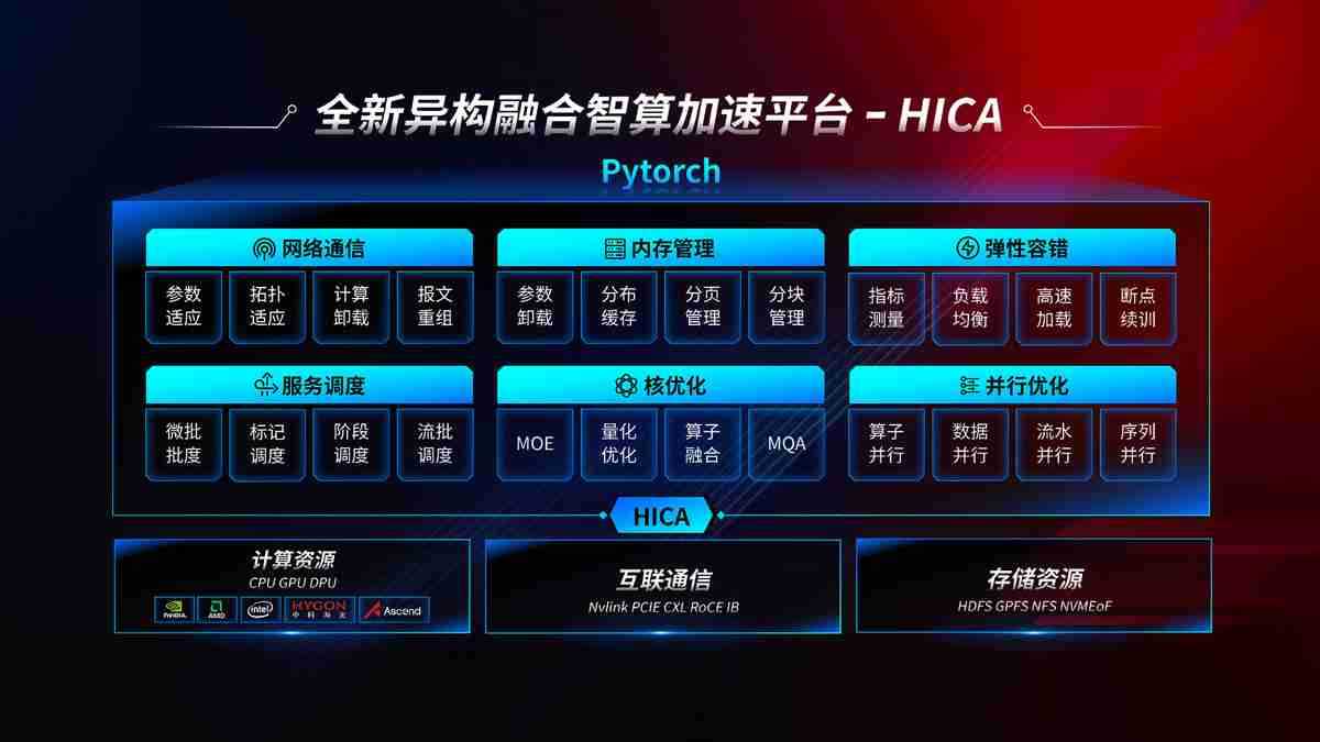 通过自研的服务层、、、中间适配层、、以及调度编排算法,,,采用数据并行、、模型并行等多种并行方式,,把并行计算任务进行有效的分解,,使其分别由相应的软件栈和算力资源来承接。。。。当GPU资源变化,,,HICA可以实时动态调度计算子任务并调整模型拓扑和架构,,,以充分聚合各种算力资源。。。